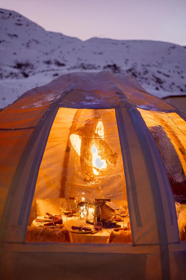 Wechseln Sie den Rahmen für ein Abendessen im Iglu in Les Menuires. Ein ungewöhnlicher Ort, um ein Essen einmal anders zu teilen und eine besondere Auszeit im Herzen der 3 Vallées zu erleben.