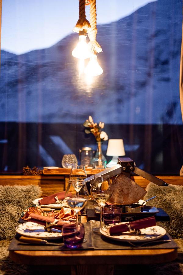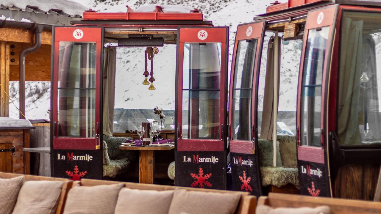 Erleben Sie ein Abendessen in einer eingerichteten Seilbahnkabine, abseits des Trubels. In einem originellen und warmen Rahmen genießen Sie einen geselligen Moment mit Blick auf die Berglandschaft. Ein ungewöhnliches Erlebnis für einen einzigartigen Abend in Les Menuires.